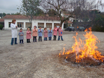 Lenda de S. Martinho ************************* Num dia de tempestade ia um soldado chamado Martinho montado no seu cavalo. No caminho estava um mendigo quase nu e cheio de frio. O soldado Martinho quando viu o pobre teve pena dele, cortou a sua capa, com a espada… e deu metade ao mendigo Assim com metade da capa do Martinho, o mendigo já caminhou mais quentinho. Quando Martinho seguia o seu caminho mal agasalhado, um sol de Estio muito quentinho apareceu e a tempestade parou. Para toda a gente se lembrar desta boa acção, a chuva acaba e aparece sempre nesta época um sol maravilhoso. Por isso chamamos o Verão de S. Martinho. Fotos cedidas pela D. Sandra, mãe do Alexandre.************** Foi assim o São Martinho no nosso Jardim de Infância. Estávamos muito ansiosos com a chegada dos familiares para participarem conosco no Magusto. Como era dia de trabalho, só chegariam perto do almoço pelo que estivemos a dançar música tradicional portuguesa na nossa sala. Depois fomos preparando a fogueira cá fora, cantamos canções, acendemos a fogueira. Que máximo, a fogueira era grande e deitava muito fumo! Apanhamos as castanhas para os cartuchos e depois tivemos uma surpresa. A Dona Anabela, trouxe a viola e cantou canções para crianças e até cantou a canção dos bons dias que nós cantamos na escola: foi o filho Gabriel que lhe ensinou!.... Por fim, almoçamos pais e filhos e o Sr. Presidente da Junta. Foi um agradável convívio.